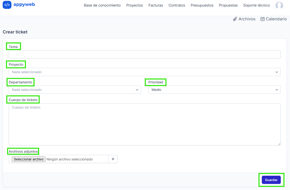 Nos aparece el desglose del ticket. Debemos rellenarlo con el tema del cual vamos a hablar, del proyecto del que vamos a hacer referencia, el departamento al que pertenece, la prioridad y el cuerpo del ticket, es decir, la descripción.