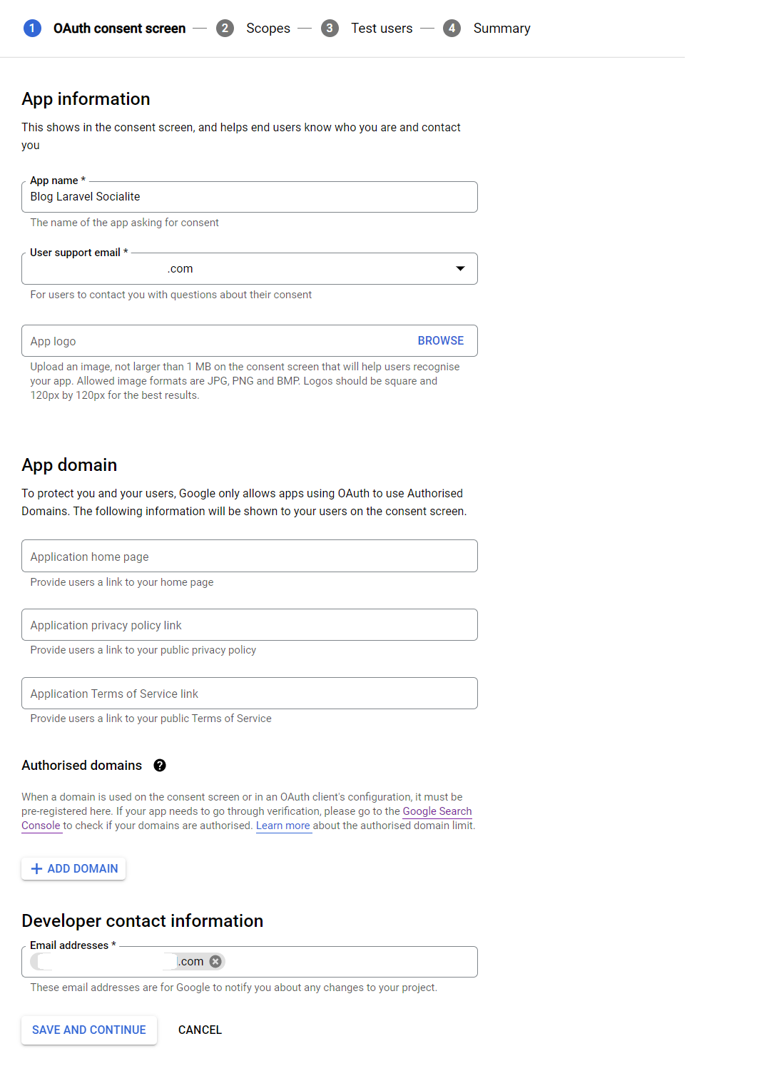 Rellena el formulario con. Aquí solo relleno el nombre de la aplicación, el correo electrónico de soporte al usuario y la información de contacto del desarrollador, y luego hago clic en "Guardar y continuar".