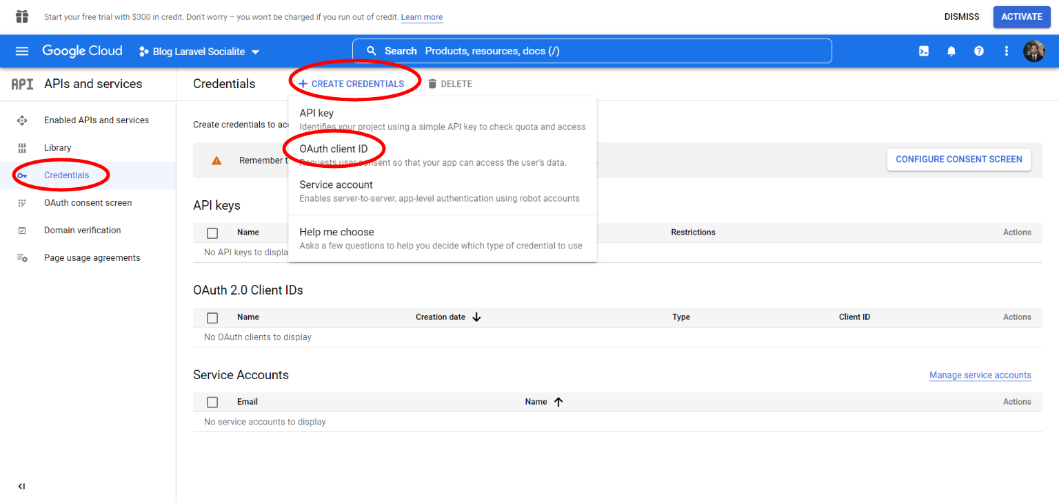Cree la credencial eligiendo "Credenciales" en la barra lateral, haga clic en el botón "Crear credenciales" y elija "ID de cliente de OAuth"
