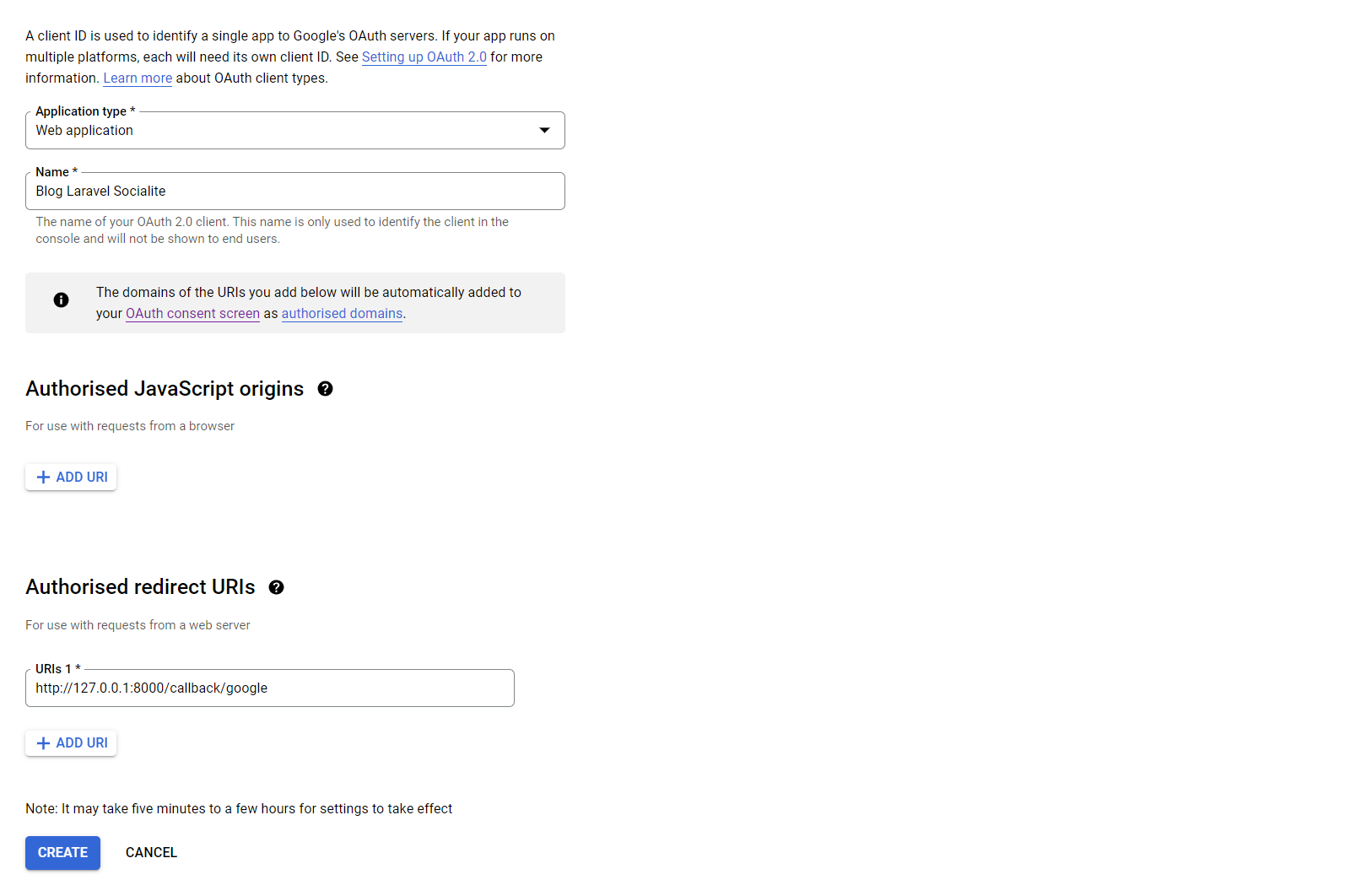 Aquí podemos completar los detalles sobre nuestra aplicación y completar los URI de redireccionamiento autorizados. Este es el URI que utilizaremos para redirigir al usuario después de que elija su cuenta de Google para iniciar sesión en nuestra web. Por ejemplo, aquí lo uso para el URI de devolución de llamada.
