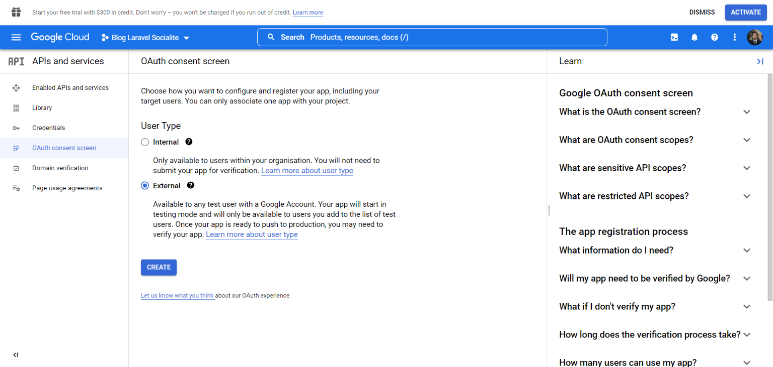 Si dice que primero debemos configurar la pantalla de consentimiento, haga clic en el botón