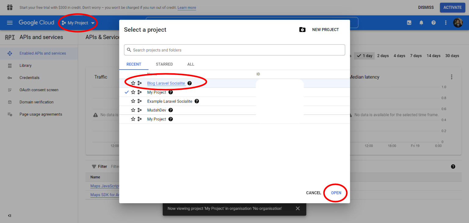 Cambie a nuestro nuevo proyecto haciendo clic en el cuentagotas del proyecto que se muestra en la barra de navegación de arriba, haga clic en el proyecto y haga clic en el botón "Abrir".